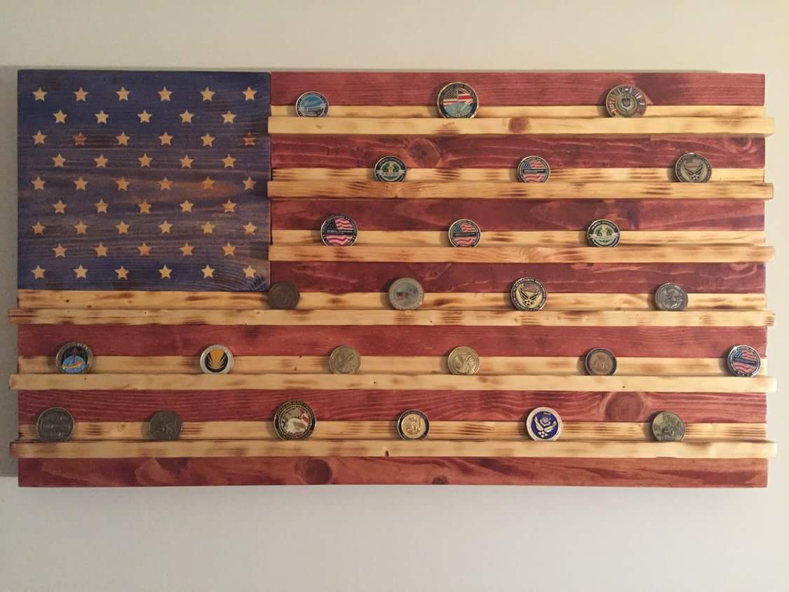 Display your challenge coins on this American flag themed challenge coin display. The size is 36" x 24" x 2/25" (approximate) and will easily hold 100 challenge coins, or more. The star field can be customized with various logos, such as branch of military service, police or fire sheilds, etc. Contact us to discuss your customization ideas.