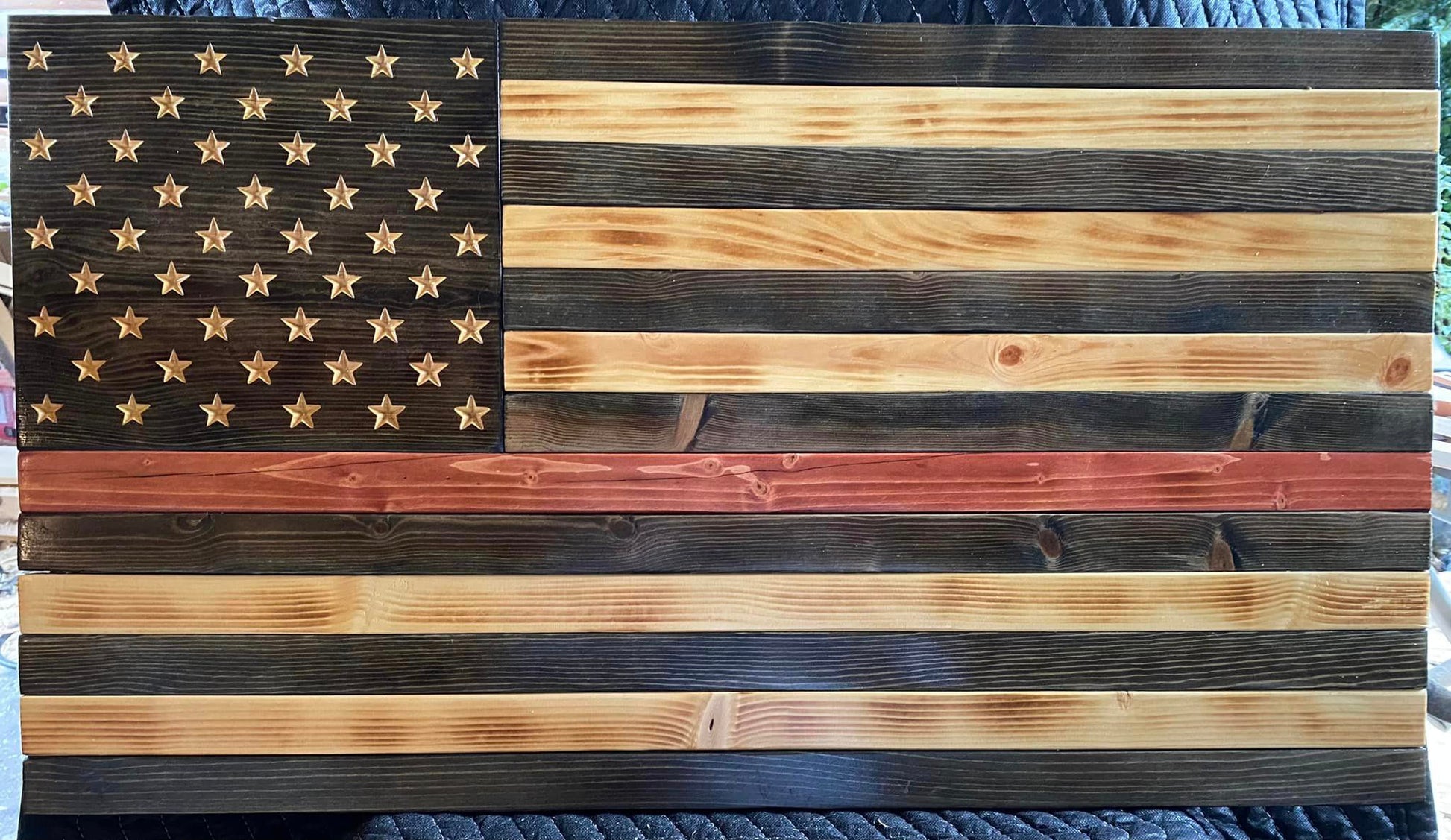 This is a wooden representation of a flat Red-line American Flag made from pine, representing our firefighters. The available sizes are 36" x 20" x 1.5" and 24" x 13" x 1.5" (approximate). The stars are carved as 3D. The picture is a representation. Each flag has it's own unique flare created by changing woodgrains of the pine. It can be customized with department, badge, names, etc. Contact us for details.