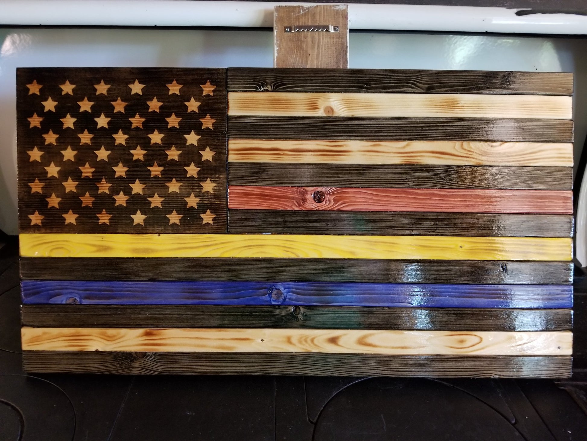 This is a wooden representation of a flat First Responder American Flag made from pine, representing our ultimate first responders - 911 Dispatchers. The available sizes are 36" x 20" x 1.5" and 24" x 13" x 1.5" (approximate). The stars are carved as 3D. It can be made with just the gold line, or with blue and/or red to represent the law enforcement and/or fire agencies they disptach. The picture is a representation. Each flag has it's own unique flare created by changing woodgrains of the pine. It can be customized with department, etc. Contact us for details.