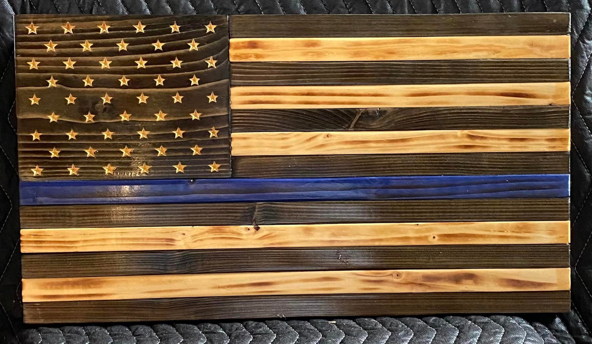 This is a wooden representation of a flat Blue-line American Flag made from pine, representing law enforcement. The available sizes are 36" x 20" x 1.5" and 24" x 13" x 1.5" (approximate). The stars are carved as 3D. The picture is a representation. Each flag has it's own unique flare created by changing woodgrains of the pine. It can be customized with department, badge, names, etc. Contact us for details.