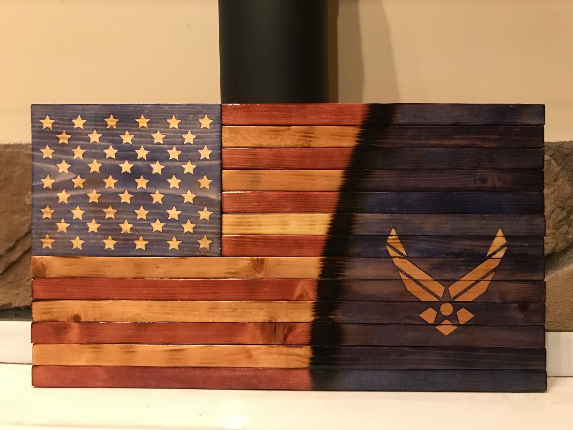 This is a wooden representation of a flat American Flag with the US Air Force logo incorporated. It is made from pine. The available sizes are 36" x 20" x 1.5" and 24" x 13" x 1.5" (approximate). The stars and US Air Force logo are carved as 3D. The picture is a representation. Each flag has it's own unique flare created by changing woodgrains of the pine.