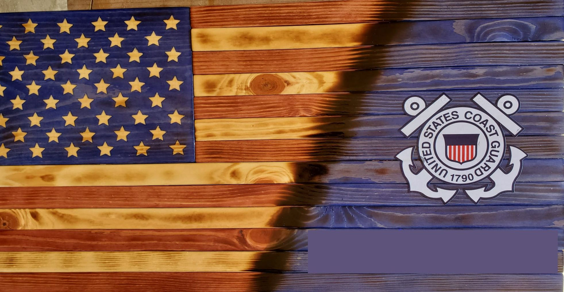 This is a wooden representation of a flat American Flag with the US Coast Guard logo incorporated. It is made from pine. The available sizes are 36" x 20" x 1.5" and 24" x 13" x 1.5" (approximate). The stars are carved as 3D. The Coast Guard logo is a vinyl applique. The picture is a representation. Each flag has it's own unique flare created by changing woodgrains of the pine.