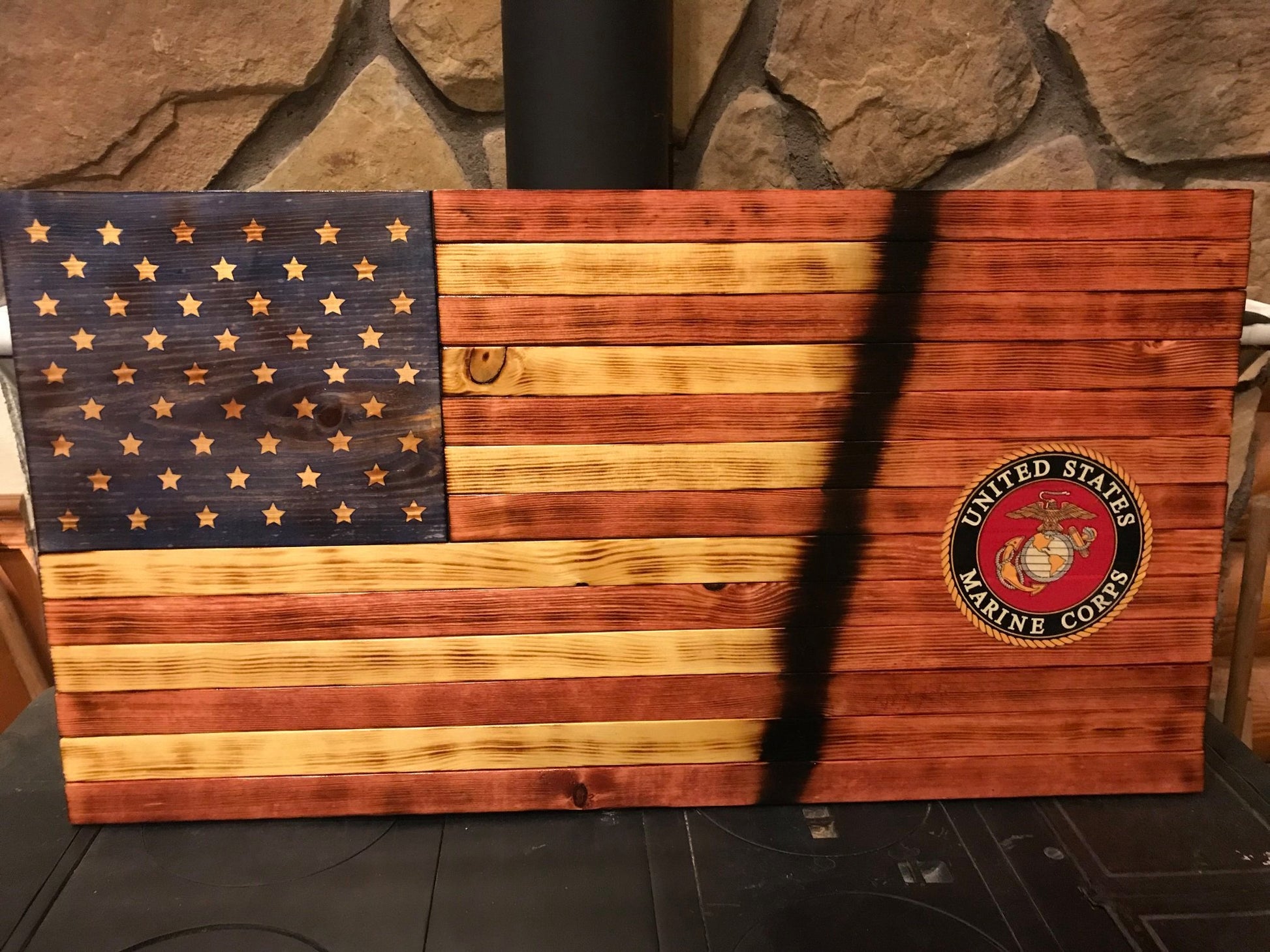 This is a wooden representation of a flat American Flag with the US Marine Corps logo incorporated. It is made from pine. The available sizes are 36" x 20" x 1.5" and 24" x 13" x 1.5" (approximate). The stars are carved as 3D. The Marine Corps logo is a vinyl applicaque. The picture is a representation. Each flag has it's own unique flare created by changing woodgrains of the pine.