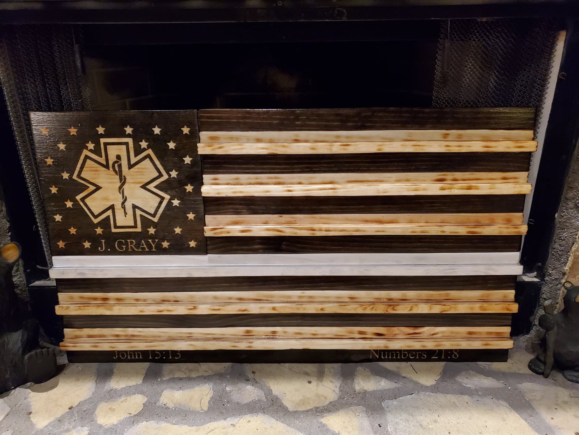 This is a wooden representation of a White-Line American flag representing our EMS and Paramedics. The sizes are 36" x 24" x 1.5" (approximate). The star field can be customized with various logos, department, badge etc. Contact us to discuss your customization ideas. (Note image shown is the coin flag. This flag will not have the coin display rails.)