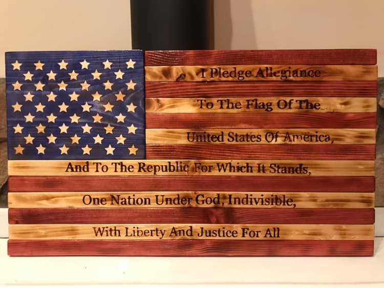 This is a wooden representation of a flat American Flag with Pledge of Allegiance made from pine. The sizes are 36" x 20" x 1.5" and 24" x 13" x 1.5" (approximate). The stars are carved as 3D. The Pledge is engraved with a laser. The picture is a representation. Each flag has it's own unique flare created by changing woodgrains of the pine.