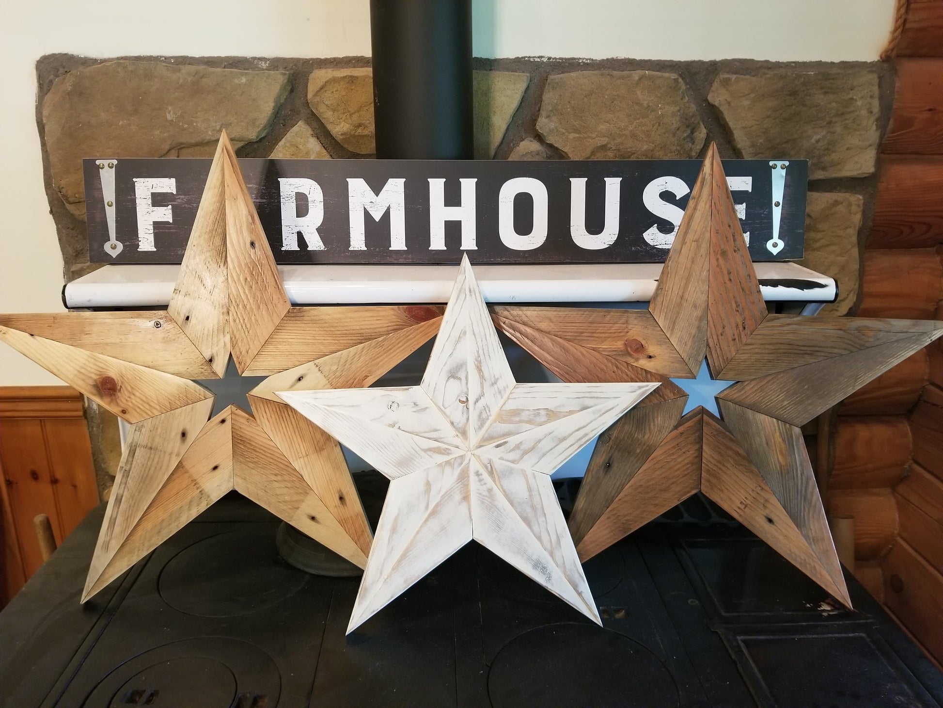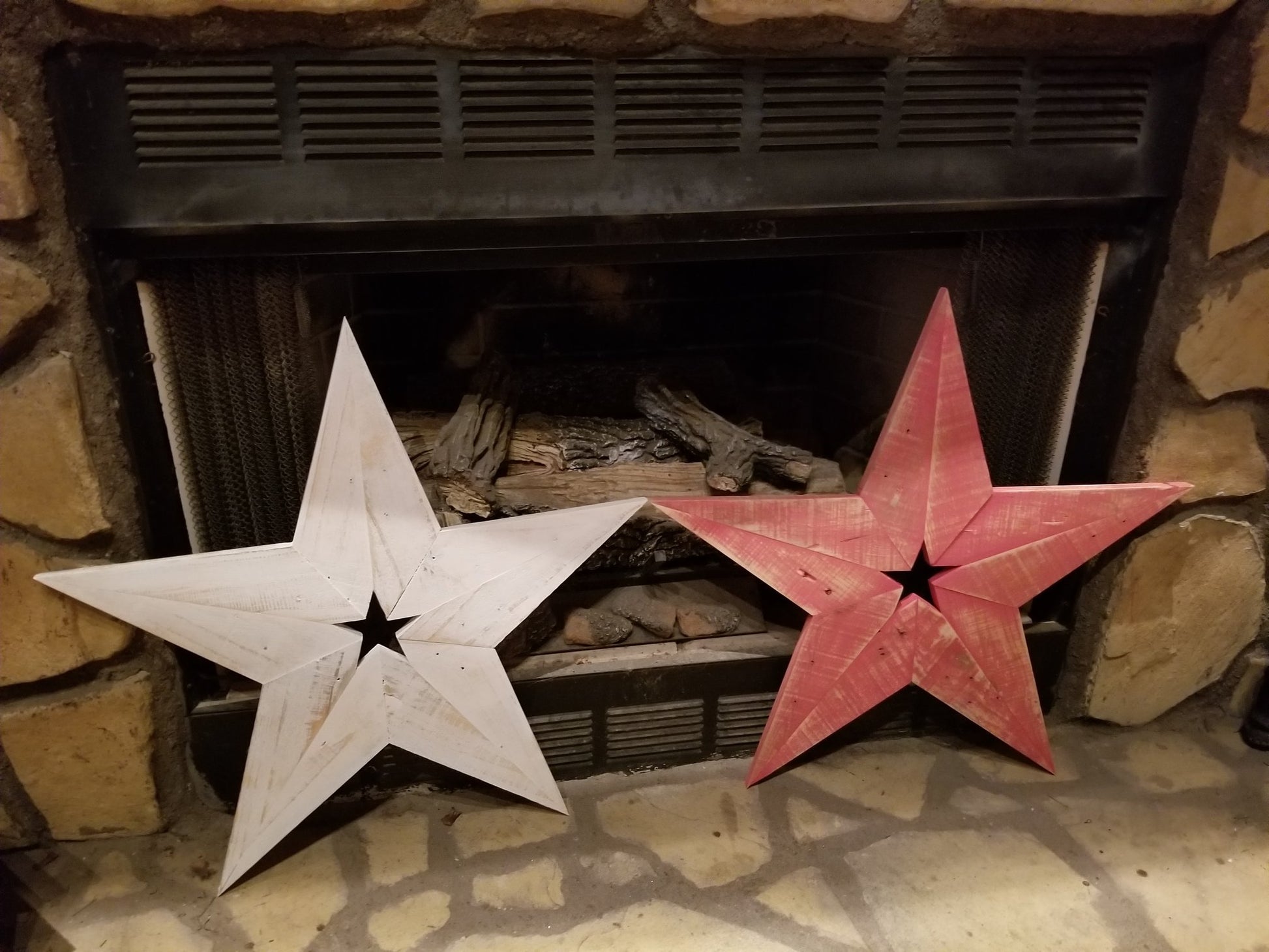 Wooden star made from pallet wood.. Can be had in solid or with a star shaped hole in the center. Available in a range of stains and paints. Painted stars have a diestressed finish. Sizes range from about 18" to 22" in diameter.