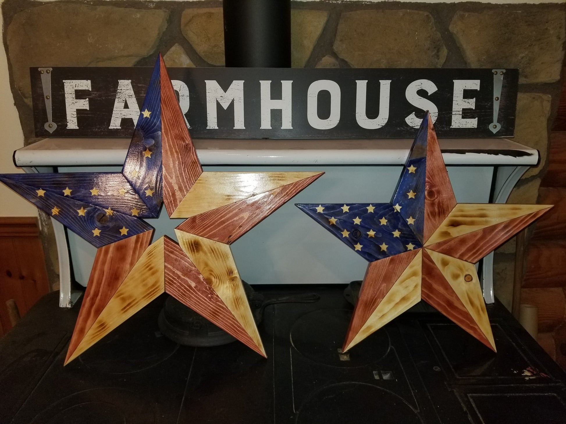 Wooden star decorated in the style of the US Flag. Can be had in solid or with a star shaped hole in the center. Sizes range from about 18" to 22" in diameter.