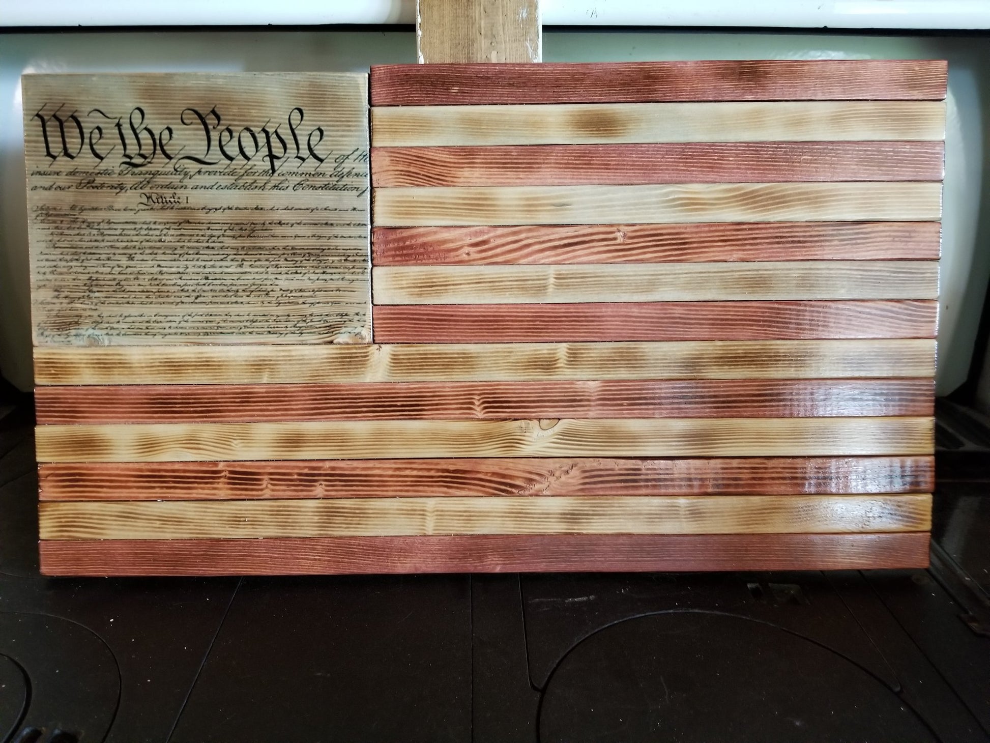 This is a wooden representation of a flat American Flag with a portion of the Constitution Preamble in place of the stars and is made from pine. The over all size is 24" x 13" x 1.5" (approximate). The Constitution Image can either be done with a laser or as an an image transfer. The picture is a representation. Each flag has it's own unique flare created by changing woodgrains of the pine.