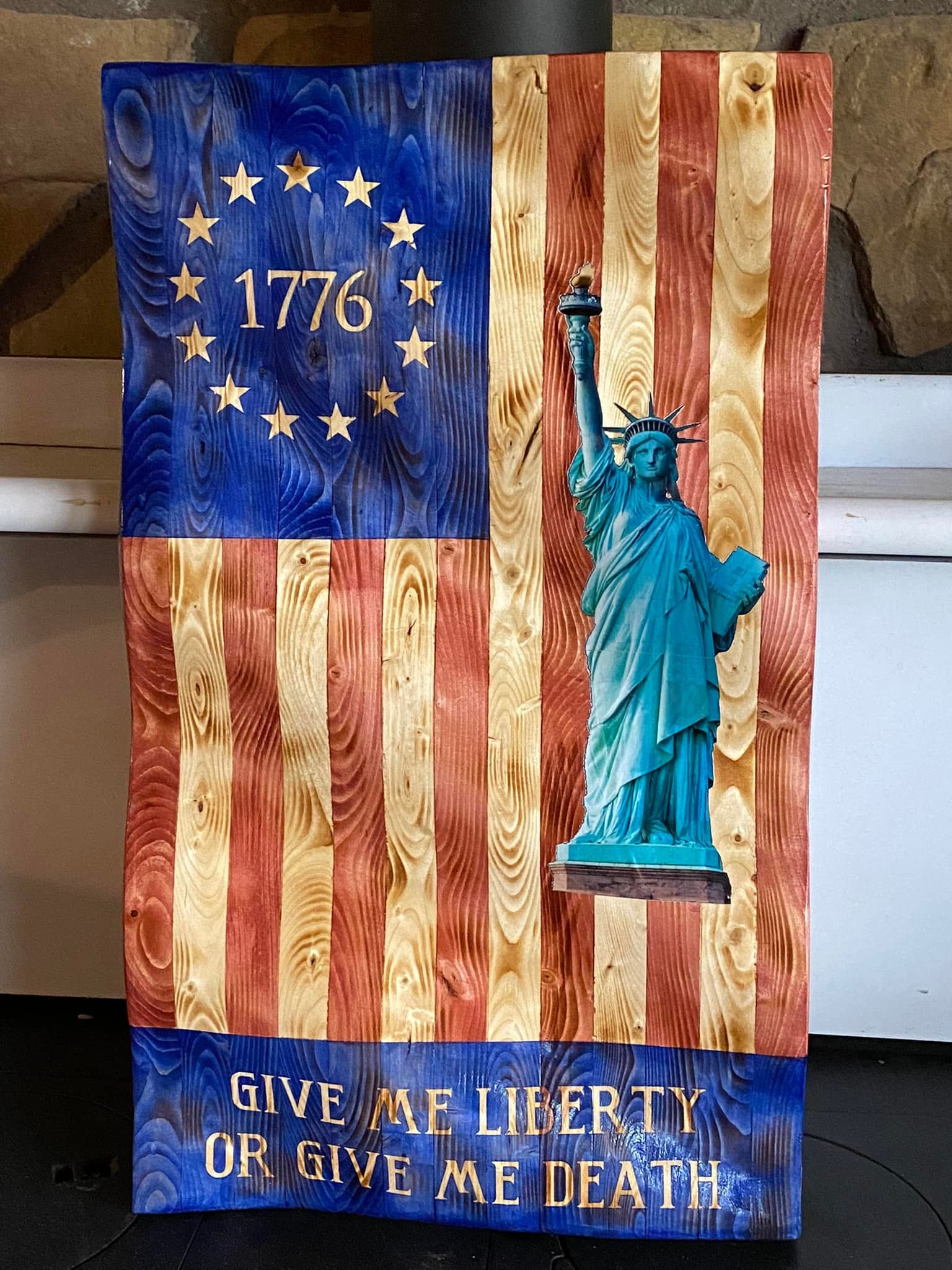 This is a wooden representation of a vertical American Flag waving in the wind with an image of the Statue Of Liberty (optional) and the words "Give Me Liberty Or Give Me Death". The flag is made of pine and is 24" x 13" (size is approximate). The picture is a representation. The Statue Of Liberty image is vinyl. Each flag has it's own unique flare created by changing woodgrains of the pine.