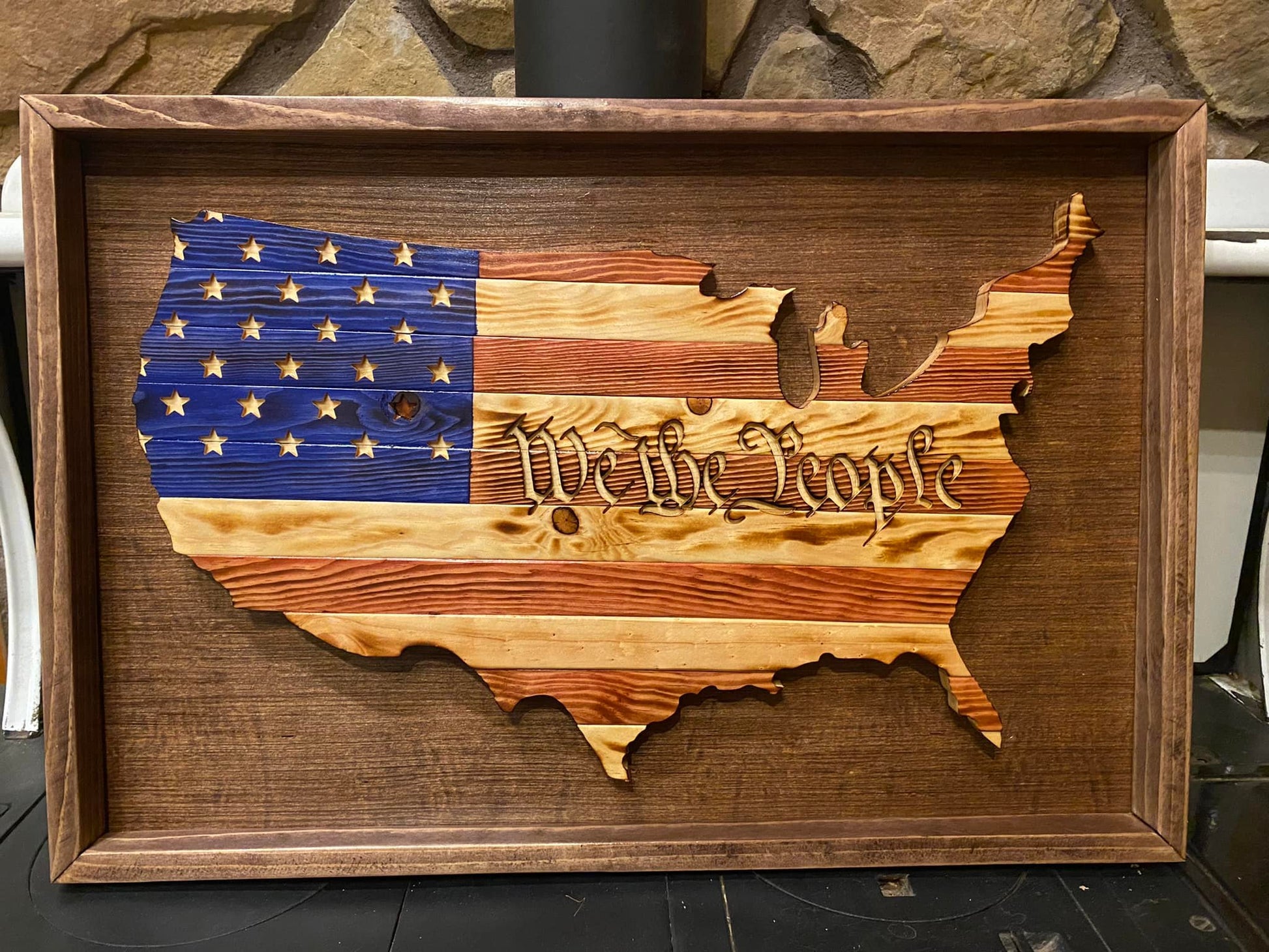 This is an cut-out of the United States using a wooden American Flag with the words We The People. The letters and the stars are 3D. The overall size is approximately 27" x 17" x 1.25"