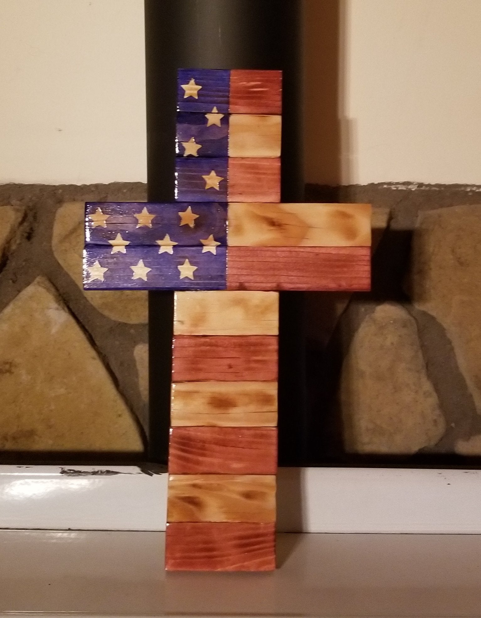 A wooden cross decorated in the style of the US Flag. Approximately 17" x 11" x 1"