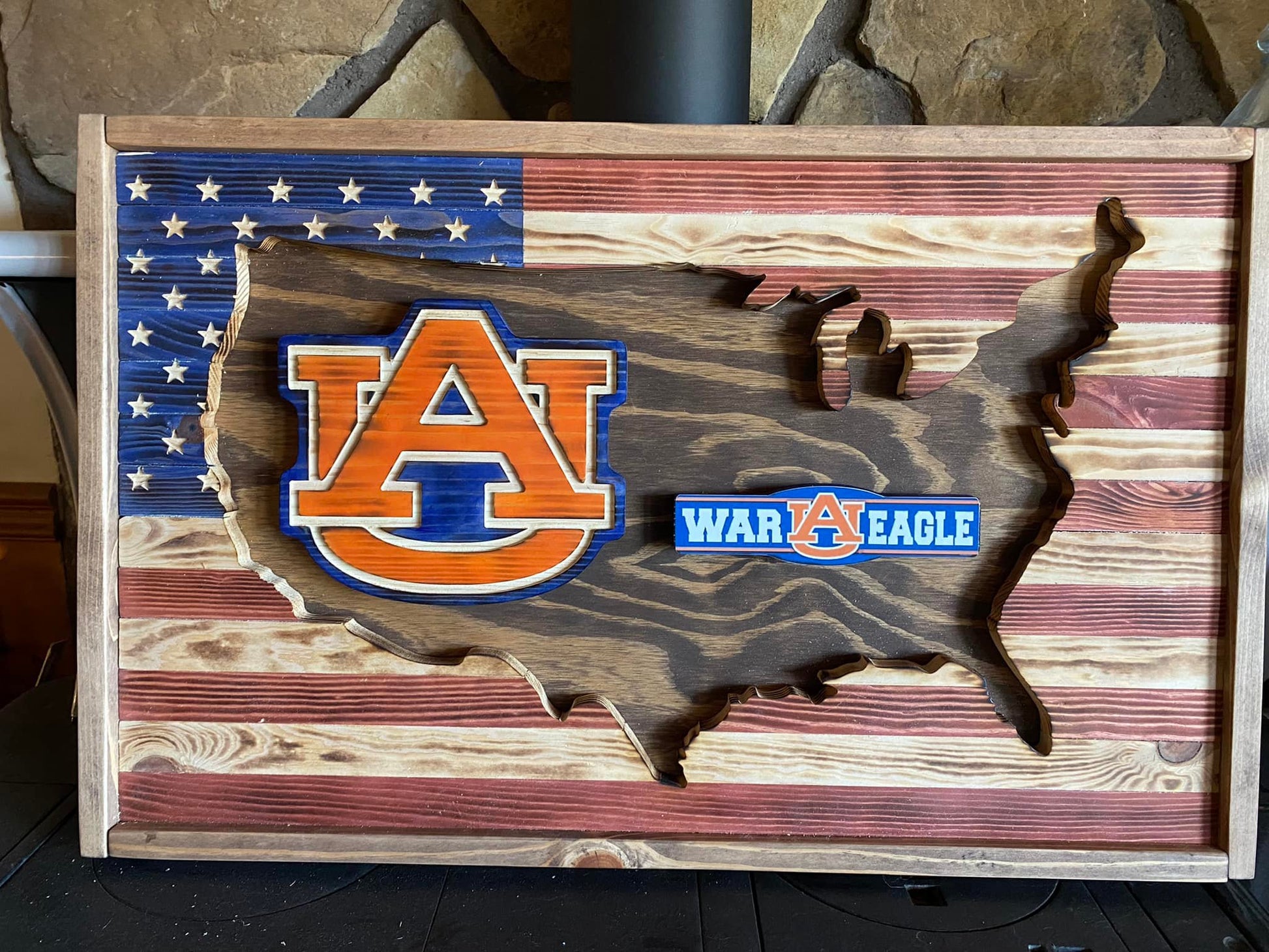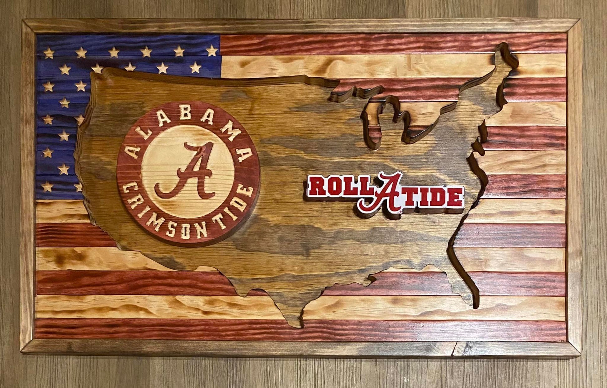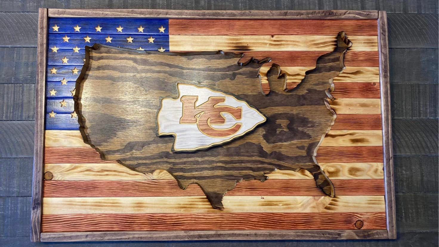 This is an outline cut-out of the United States using a wooden American Flag with your choice of Team logo and slogan. The logos and the stars are 3D. The overall size is approximately 27" x 17" x 1.25" For logos not shown, please contact us to discuss you request.