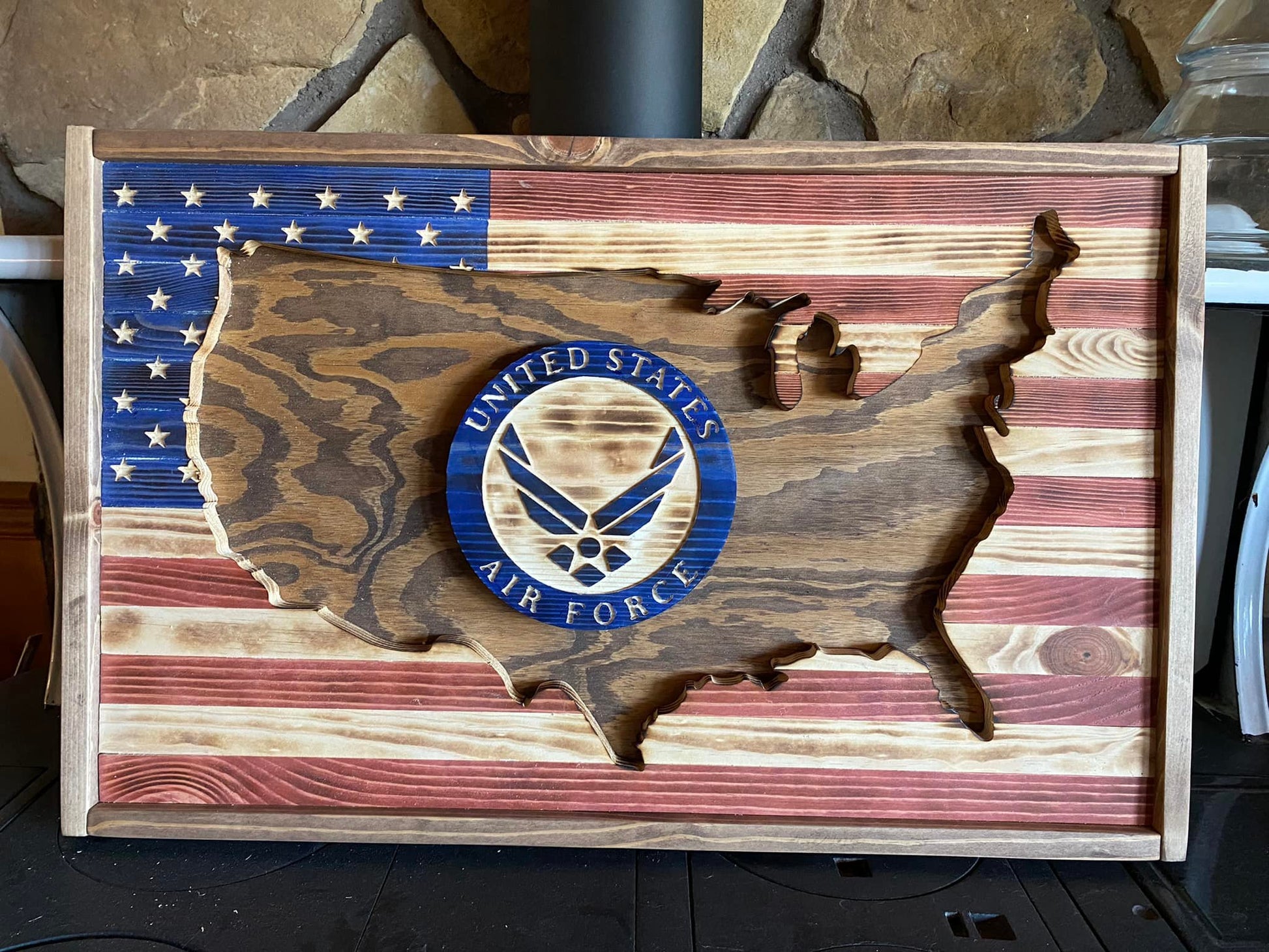 This is an outline cut-out of the United States using a wooden American Flag with the US Air Force logo. The stars and US Air Force logo are carved as 3D. The overall size is approximately 27" x 17" x 1.25"