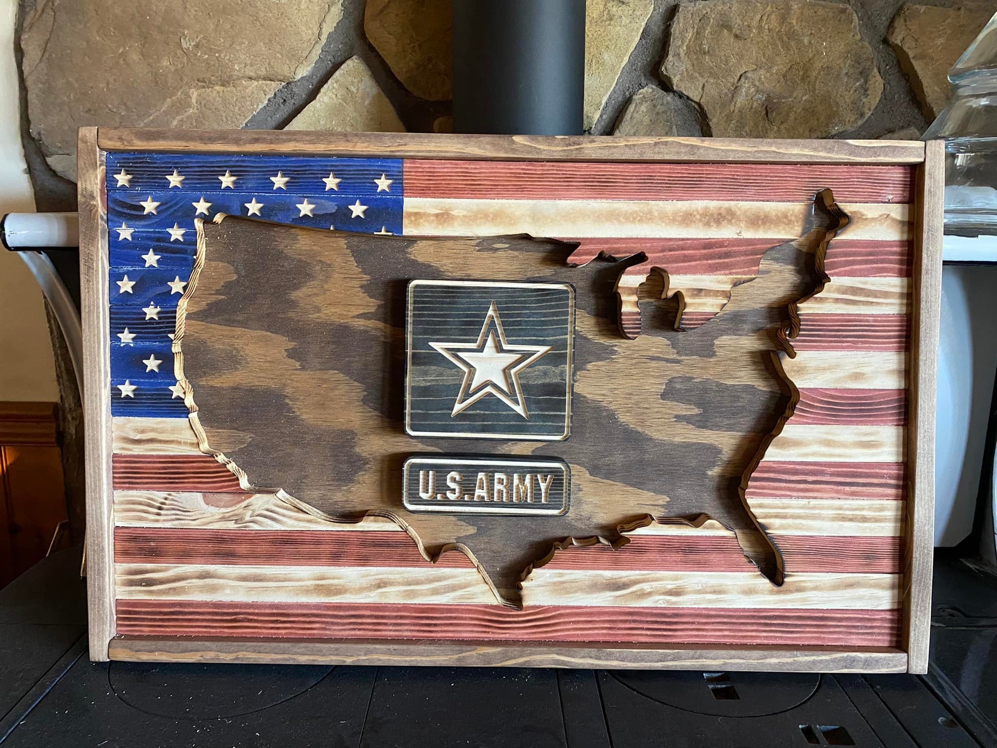 This is an outline cut-out of the United States using a wooden American Flag with the US Air Force logo. The stars and US Air Force logo are carved as 3D. The overall size is approximately 27" x 17" x 1.25"
