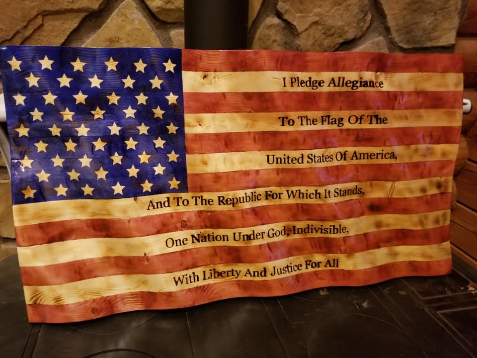 This is a wooden representation of the American Flag waving in the wind with the Pledge of Allegiance added. The flag is made of pine and is available in 36" x 20" or 24" x 13" (size isapproximate). The lettering is black vinyl. The picture is a representation. Each flag has it's own unique flare created by changing woodgrains of the pine.