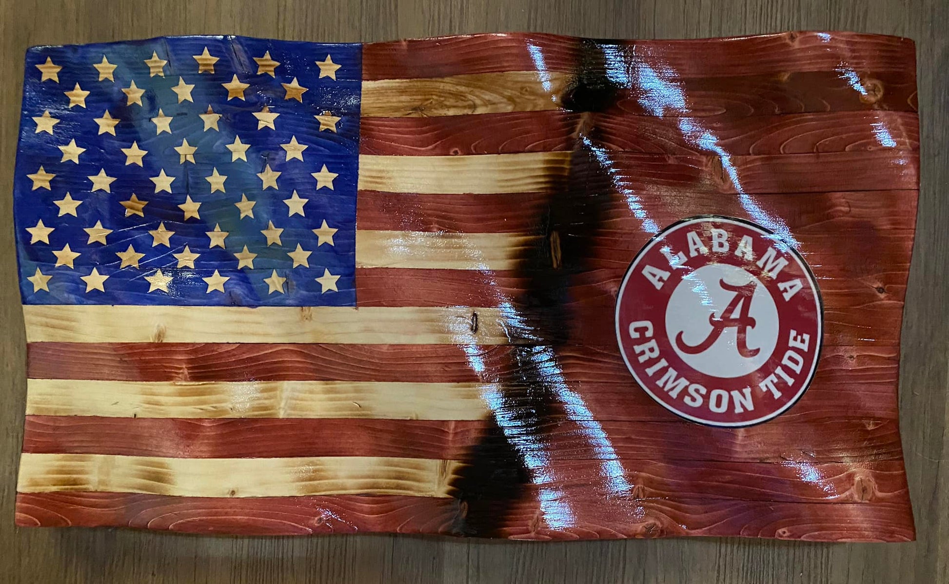 This is a wooden representation of the American Flag waving in the wind. The flag is made of pine and comes in 2 sizes - 36" x 20" and 24" x 13" (sizes are approximate) and can b. The picture is a representation. Each flag has it's own unique flare created by changing woodgrains of the pine.