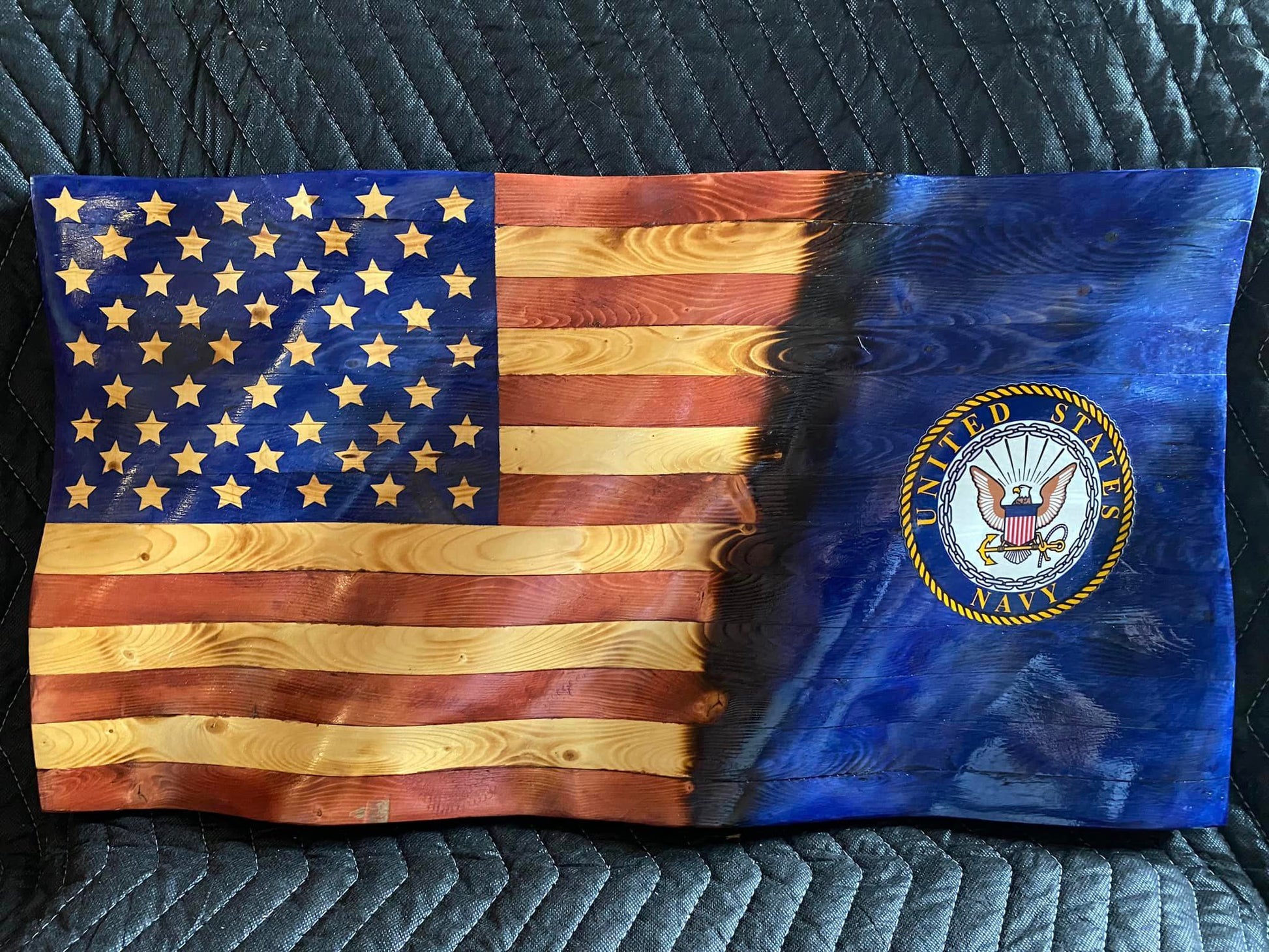 This is a wooden representation of an American flag, waving in the wind, with the US Navy logo incorporated into the flag. The sizes are 36" x 20" x 1.5" and 24" x 13" x 1.5".