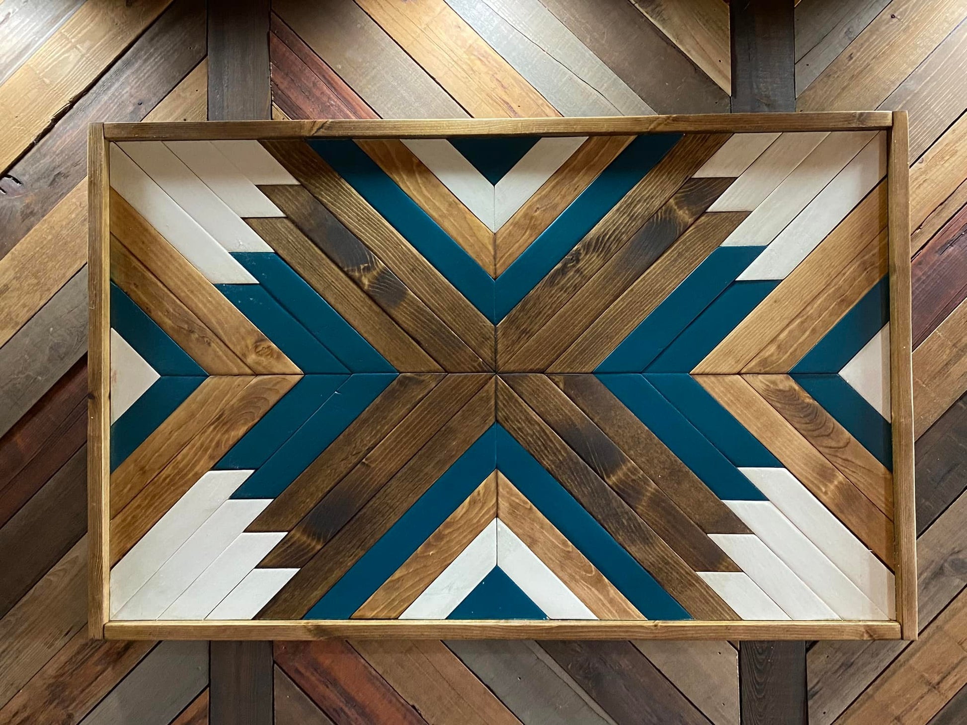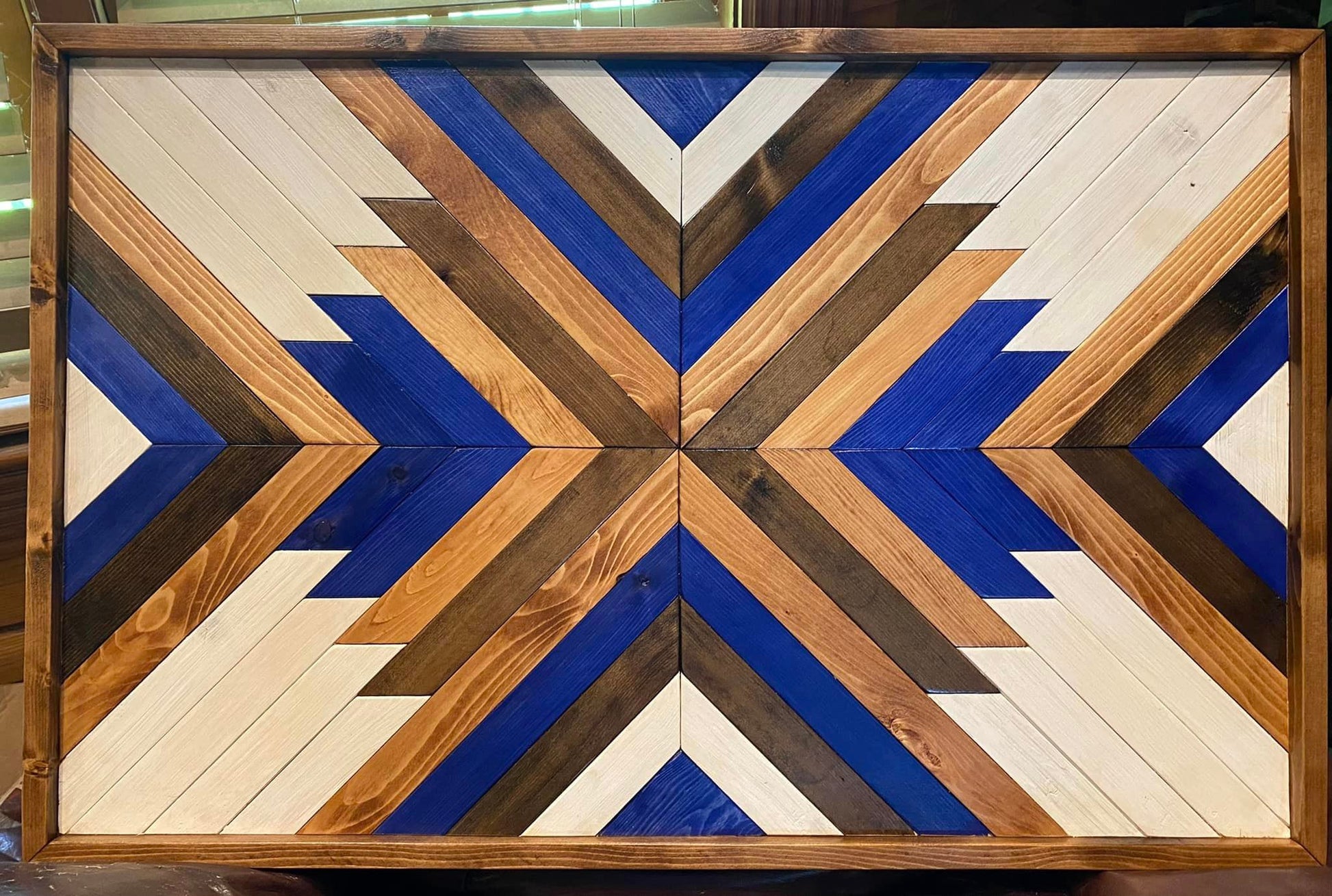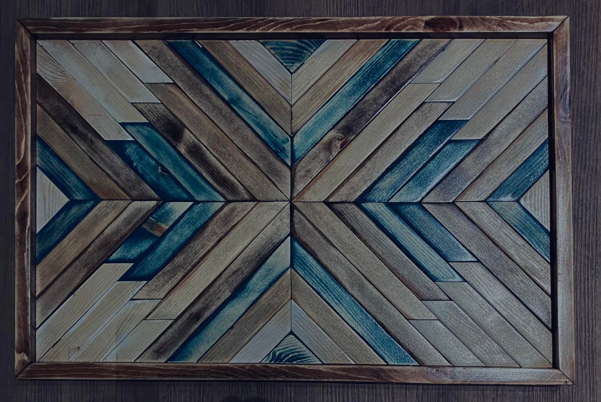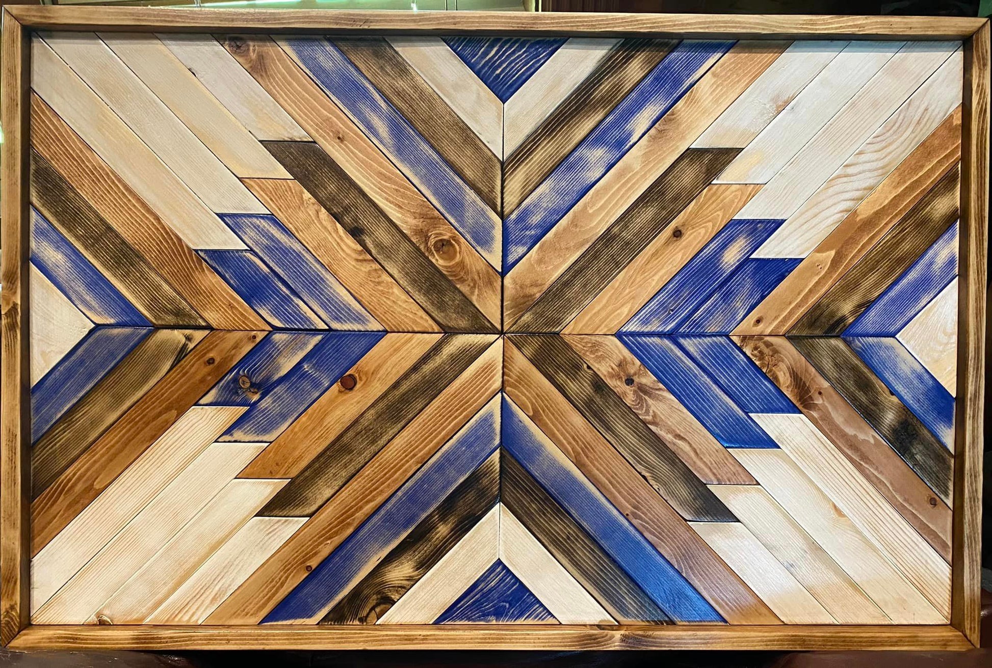 This wooden mosaic is available in two sizes, two colors and standard or distressed. Sizes are approx 26" x 20" x 1.25" (standard) and 36" x 24" x 1.25" (large)